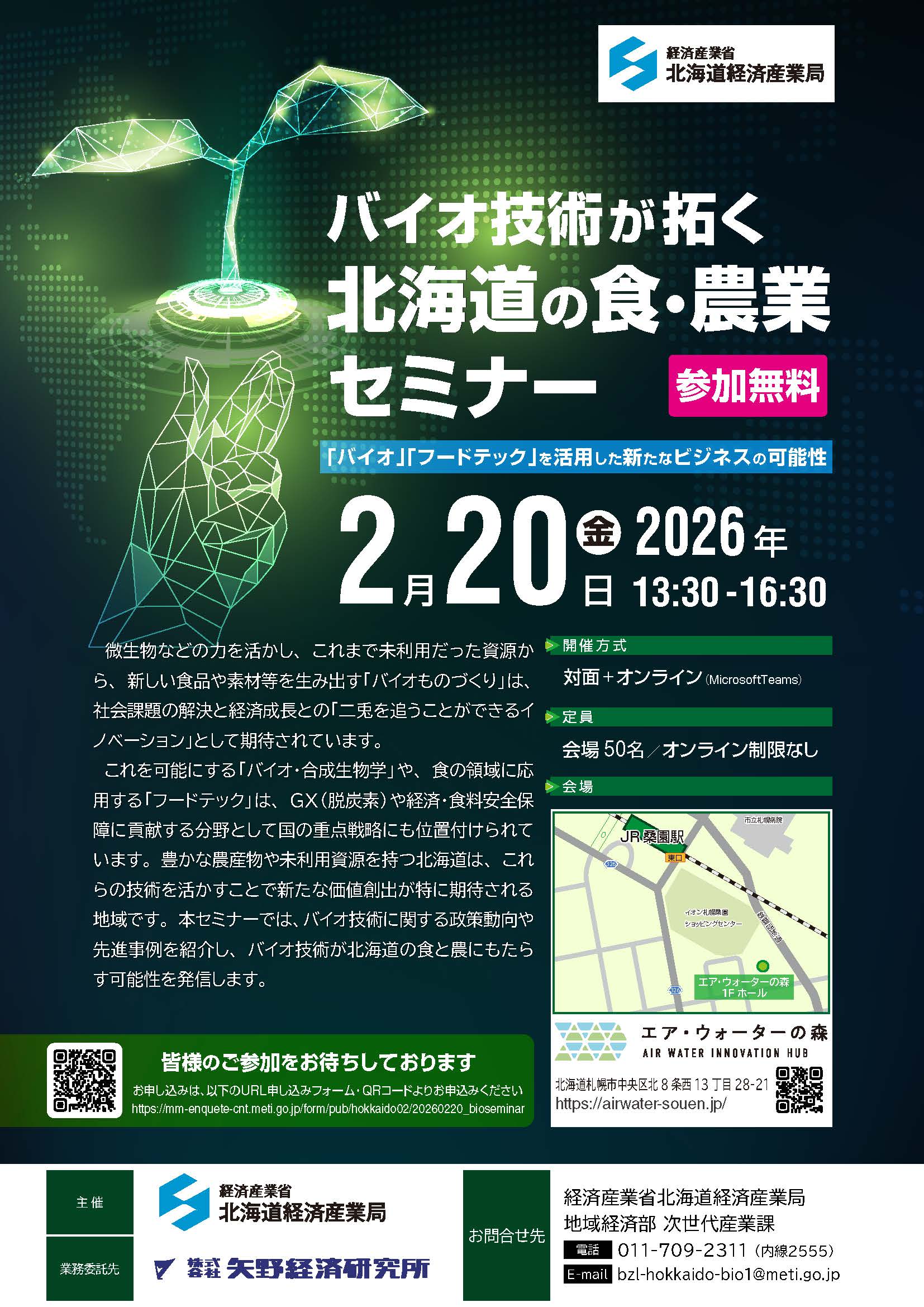 経済産業省北海道経済産業局は、北海道におけるバイオものづくり※等のバイオ技術を活用した食・農業分野における新たなビジネス・価値創出を目的としたセミナーを開催します。