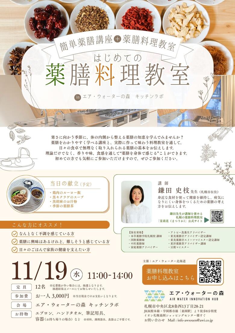 薬膳の基本をわかりやすく学ぶ講座と、実際に調理して味わう料理教室の2部構成で行います。