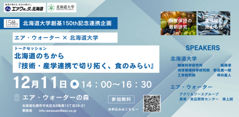 ~北海道大学創基150thにおける社会連携プロジェクト「北海道のちから 技術産学連携で切りひらく食のみらい」を開催しました~ 北大で行われている食の研究者がそろい、未来を語っていただきました! 特にフードロスという面では、物流だけではなく、物性を利用したガスコントロールや廊下物質の吸着など、非常に面白い研究テーマが出そろい勉強になった一日でした。